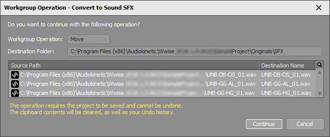 Audio source files for each type of sound object are stored in a specific folder, namely Voices and SFX. To convert from one sound object type to another, Wwise ensures to also move any associated source files between the different source folders. In the case of Sound Voice objects, however, Wwise will only move the reference language files.