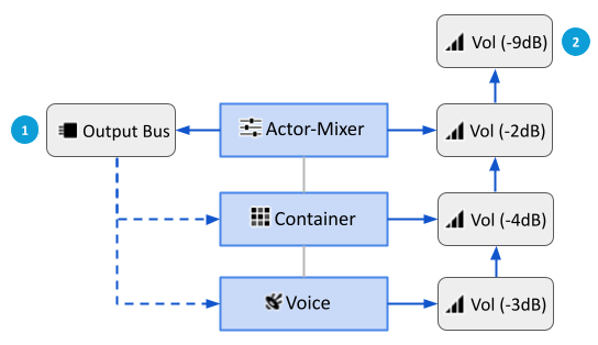 Absolute properties: In this example the Output Bus is specified by the Actor-Mixer object. This specifies the Output Bus for the Actor-Mixer object and all its descendants that do not specify an Output Bus. |