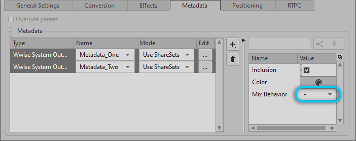 The Metadata tab for busses is exactly the same as the Metadata tab for Actor-Mixer and Interactive Music objects except that the Override parent check box does not apply. |