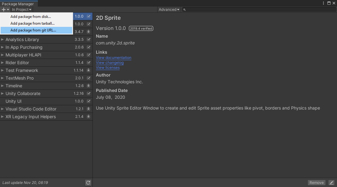 More information about using packages hosted on Git repositories can be found in the Unity documentation.