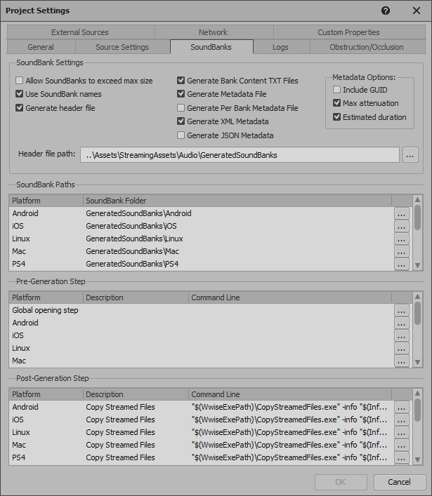 .![]() | Note: | When the target directory is changed in the Unity Wwise Project Settings, the Output Path for the external sources won't be adjusted automatically in the Wwise Project. If necessary, make sure to adjust it based on the changes made for the Root Output Path. |