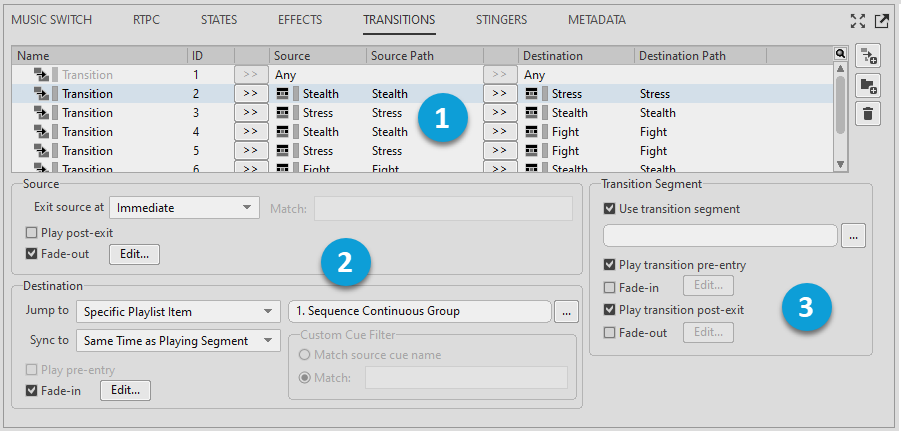 The main part of the Transitions tab is the transition matrix, a list of rules that defines how each object within a Music Switch or Playlist Container transitions to every other object within the container. It also contains controls for customizing the properties of each source and destination in a transition, and for specifying the use and properties of transition segments.