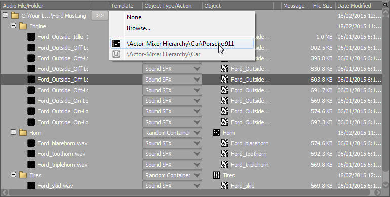 At this point, Wwise will try to automatically match the media files and folders you are importing with the objects in the template. The matching folders will be designated as the same container type as their template counterpart, while ones without a match will by default be Random Containers.