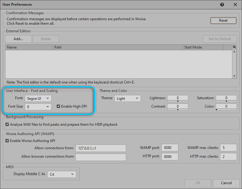 Initialization settings, used while auditioning through the Wwise authoring application, have been updated to include the ability to enable/disable System Audio Objects. When System Audio Objects are enabled for authoring, applications and games running alongside Wwise are not able to use them.