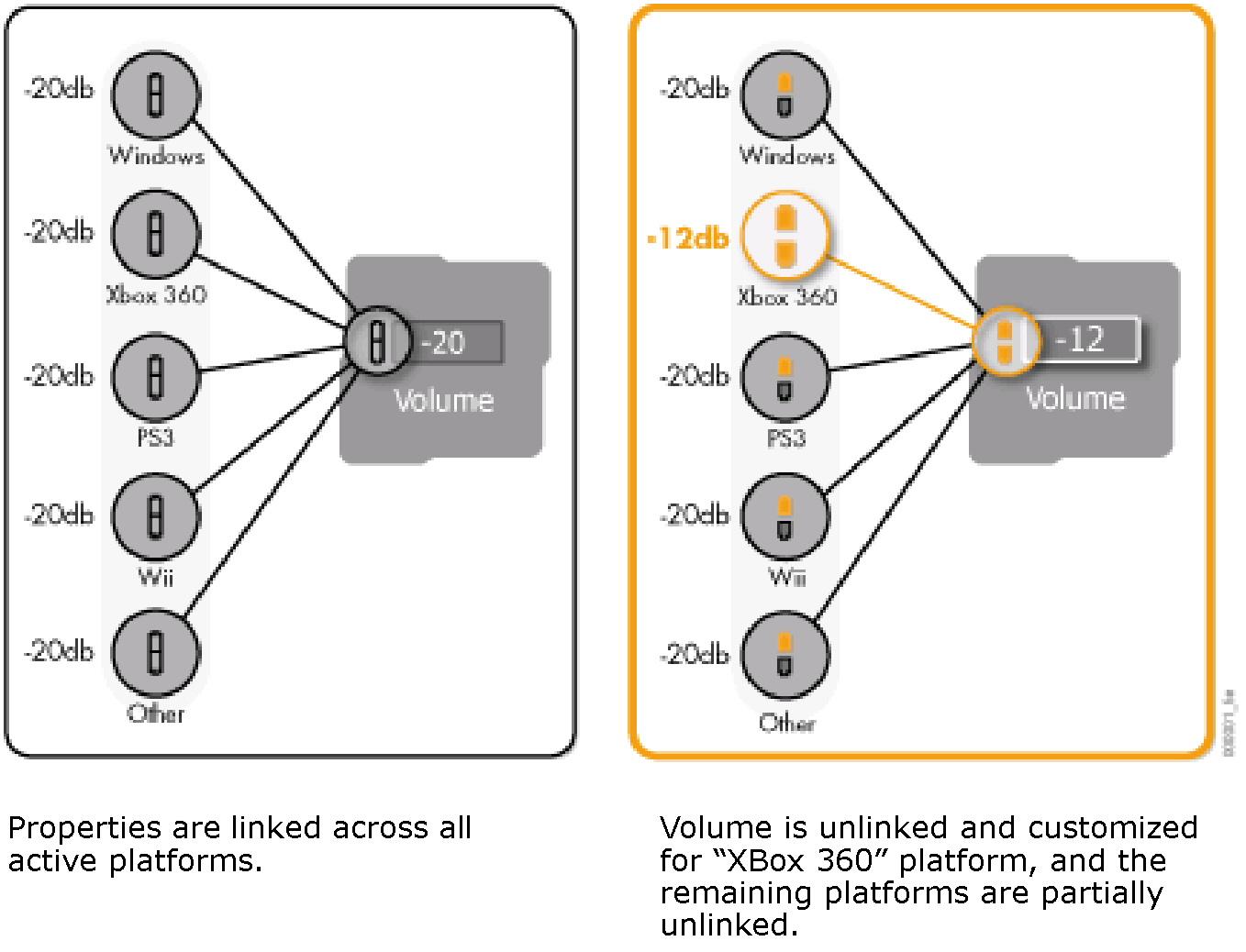 In Wwise, when you define your sound properties for a particular platform in your project, these properties are set across all active platforms by default. These properties are said to be linked across platforms. This streamlines creating projects across platforms. But, if you want to customize the properties for a specific platform you can unlink its properties, and define the properties that you want. When you unlink properties, the link indicator becomes orange.