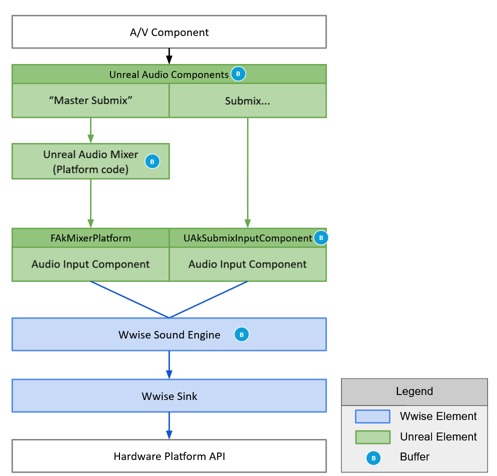 Two sequential, concurrent systems add some latency to the end mix. Unreal assumes that the A/V component plays at its own speed, and uses a circular buffer to provide audio at the same speed at which the Audio Mixer requests it.