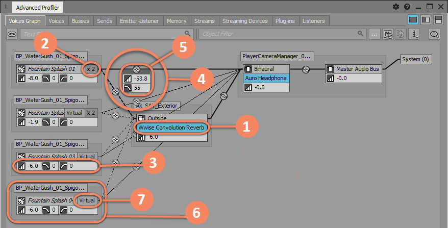 The Advanced Profiler - Voices Graph tab displays the optimized bus hierarchy as it exists in the lower engine at runtime for each of the voices or playback instances managed by the sound engine.