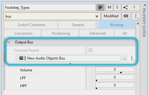 For all objects that you would like sent to the endpoint as part of the Passthrough Mix, open the Property Editor for the object and select the newly created Audio Bus as the Output Bus. You might need to select Override parent.