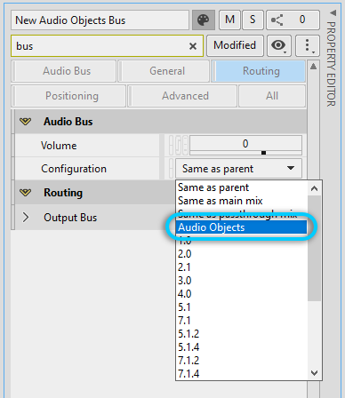 Open the Property Editor for the new Audio Bus. Set Configuration to Audio Objects.