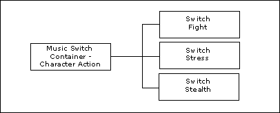 Music Switch Containers allow you to group pieces of music according to the different alternatives that exist for particular elements within a game. Each alternative is represented in the Switch Container by a Switch or state. For example, a Music Switch Container can be created for all the different types of action that can exist for your main character in the game. The container might contain Switches for fight sequences, stressful situations, and when the character is in stealth mode.