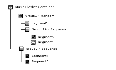 You can create complex music structures by grouping the Music Segments in your Music Playlist Container. You can add as many groups as you like, and then rearrange them, remove them, cut, copy and paste them, and populate them with Music Segments. For more information on populating your Music Playlist Container, refer to Populating a Music Playlist Container.