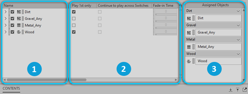 When you load a Switch Container into the Property Editor, the child objects are displayed in the Contents Editor. You can edit the properties for the child objects, assign objects to switches, and define the behavior for each object when the game calls a Switch.