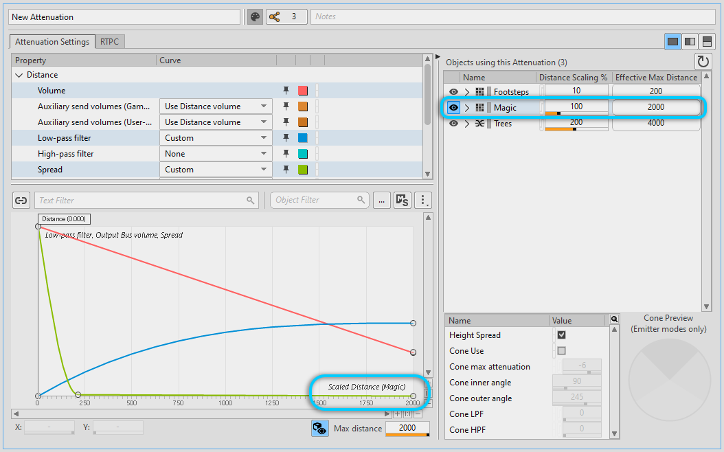 The new Distance Scaling % property expands on Wwise sound propagation features. It appears in the Attenuation Editor, which displays a list of objects that reference the attenuation. You can scale the distance of each sound by a percentage of the attenuation's Max distance. Changes to the Distance Scaling % are reflected in the Effective Max Distance field and in the attenuation graph when the eye button is selected for an object. In addition, the attenuation curves have been organized into collapsible categories.