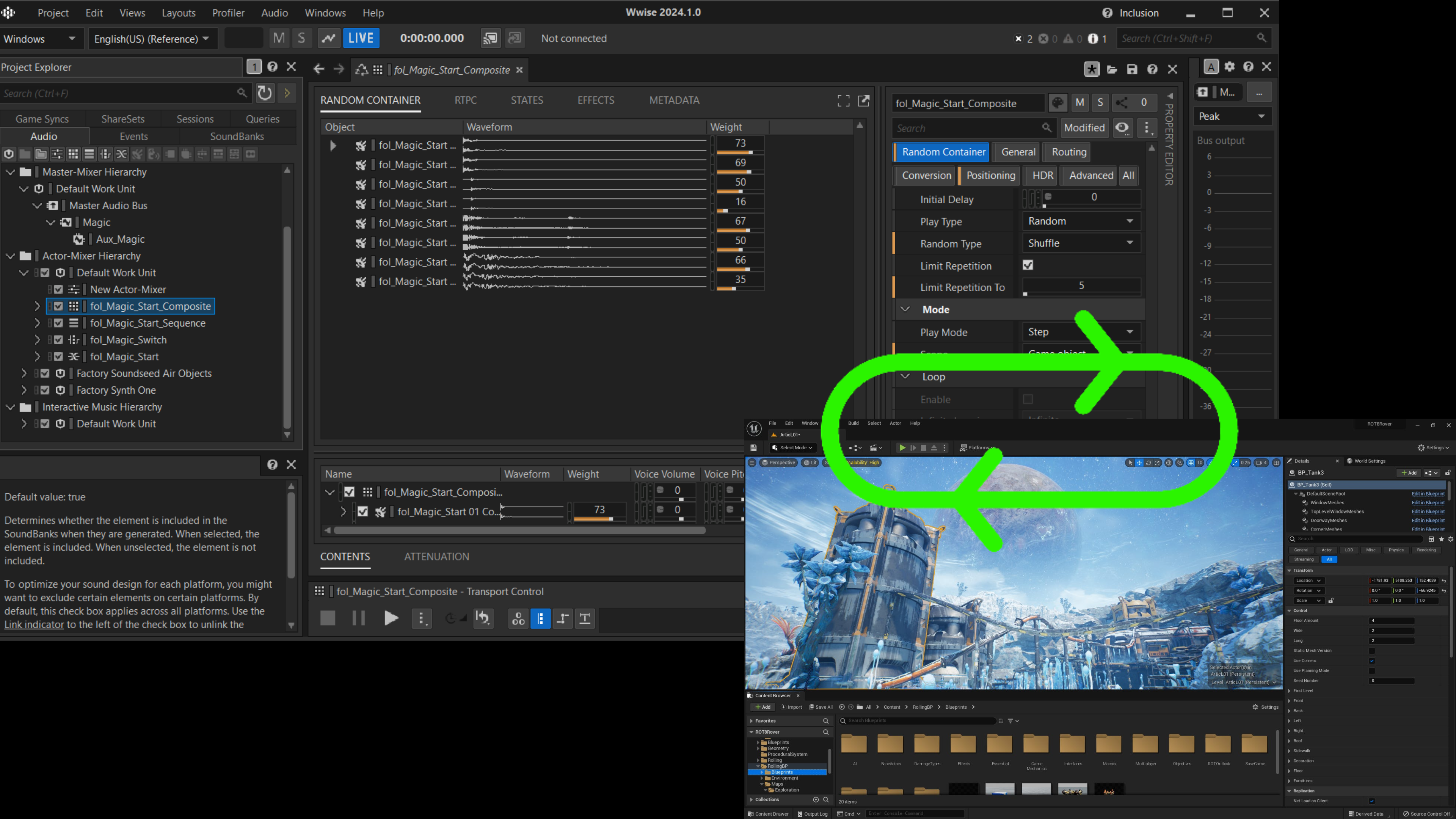 In Wwise, it has always been possible to connect to a game to profile and edit a limited set of properties at runtime in order to immediately hear changes to mixing and sound behavior. Wwise 2024.1 expands live editing options: some property editing restrictions have been removed, and new options have been added, including live editing of RTPC curves, Effects, and more.