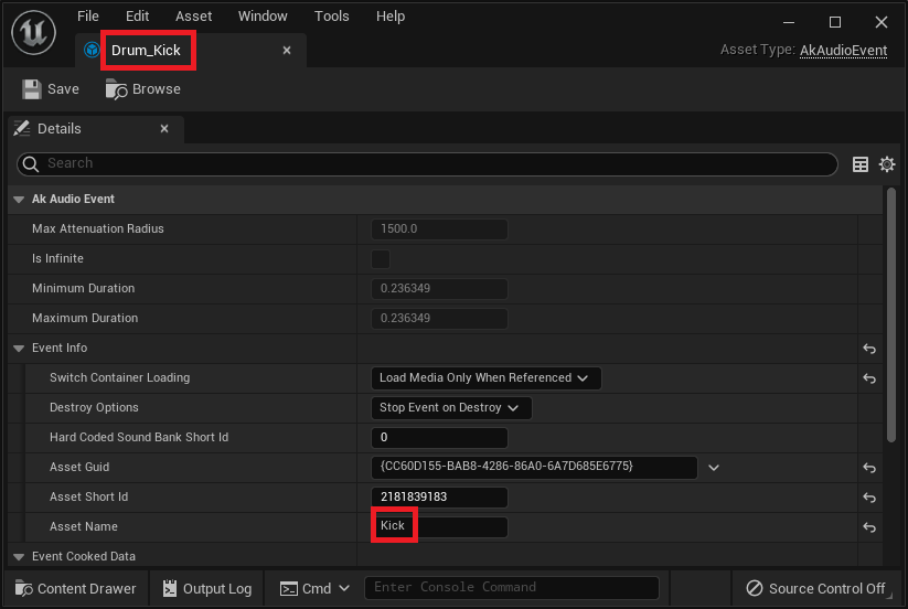 As shown in the following image, the associated Unreal and Wwise Assets can have different names. The association between the two is determined by the GUID, ShortID, and Asset Name properties. Therefore, you can rename Unreal assets without affecting the Wwise objects they reference.