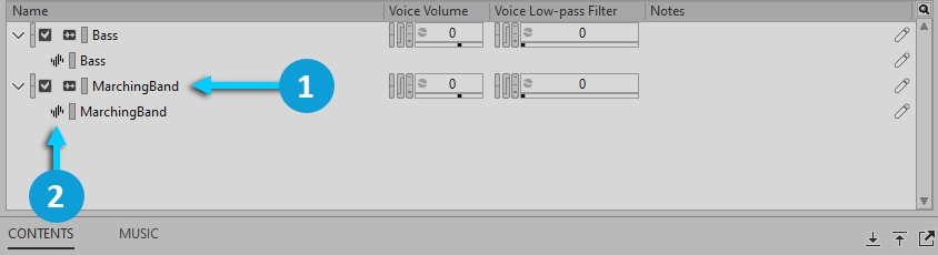 When you load a Music Segment into the Property Editor, its tracks are displayed in the Contents Editor where you can edit the object properties.