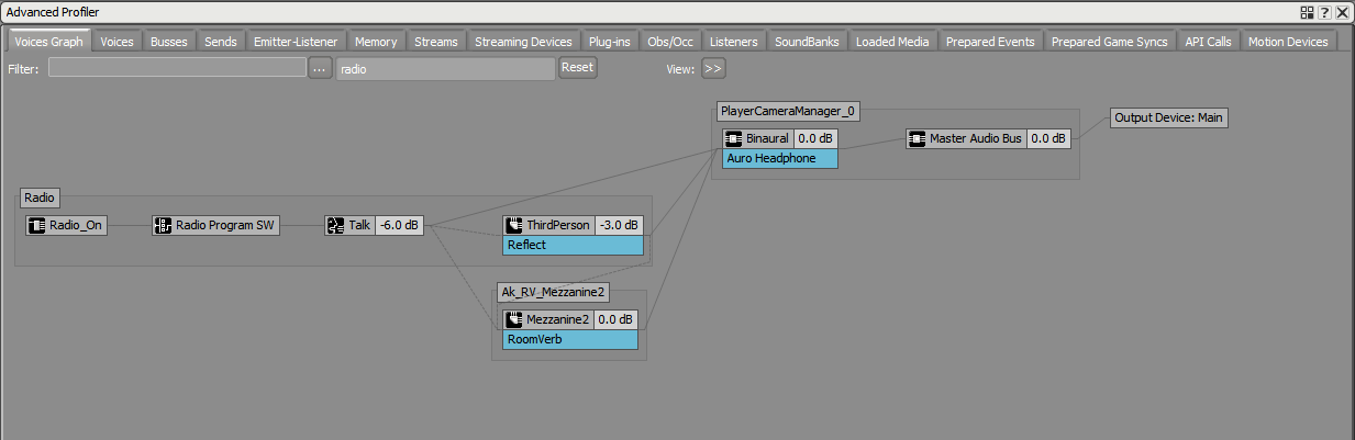The Room's reference orientation is defined in the room settings (AkRoomParams::Up and AkRoomParams::Front), and never changes. The corresponding game object's orientation is made equal to the Room's orientation. When the listener is in a Room, the bus's Spread is set to 100 (360 degrees) by Spatial Audio. Thanks to 3D positioning, the output of the reverb is rotated and panned into the parent bus based on the relative orientation of the listener and the Room. This happens because the Auxiliary Bus is tied to the Room's game object, while its parent bus is tied to the listener. The screenshot below shows an emitter, the radio, sending to the Auxiliary Bus Mezzanine2. You can see that a separate game object has been created for this room, Ak_RV_Mezzanine, that is neither the Radio nor the listener (PlayerCameraManager_0).