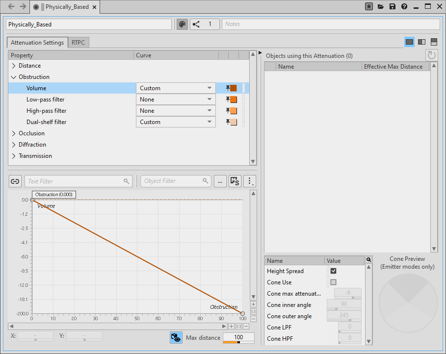 In Wwise, you can define platform-specific volume, LPF, HPF, and DSF curves to apply to sound objects when they are affected by obstruction, occlusion, diffraction, and transmission during gameplay. The values you define are relative and are accumulated with any values already applied to the game object. Volumes and DSF values are accumulated through addition, while LPF and HPF values are accumulated by retaining the highest value.
