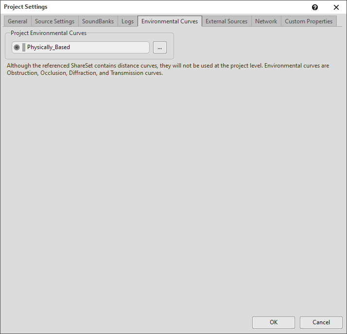 Within the Project Environmental Curves group, click on the "..." button to choose an attenuation ShareSet to be used at the project level. A ShareSet can be used both at the project level and on an individual sound.