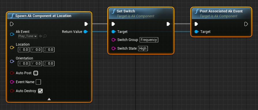 Auto Post: Controls whether to post the event immediately upon the component's creation. The default value is false.Auto Destroy: Controls whether to destroy the component when the first Event posted on this component is done. The default value is true.You can use this Blueprint node to set a Switch on a fire-and-forget sound. To do so, disable Auto Post, set a Switch on the spawned Ak Component, and then post the Event, as shown in the following image: