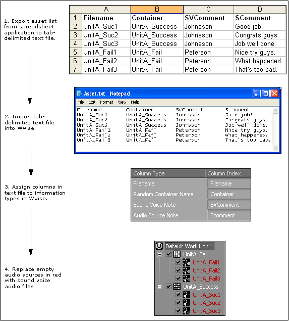 The following illustration demonstrates the workflow for getting your voice asset list from a spreadsheet program into Wwise.