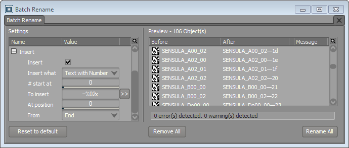The Insert section is the third of three sections in the Batch Rename Settings panel. In this section, users can insert text and printf format number patterns in object names or notes using simple replacement and character positioning.