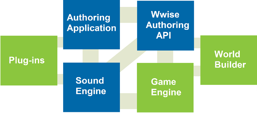 An interface between Wwise and world builders (Wwise Authoring API)—a unique plug-in interface with external game world builders or 3D applications that enables external applications to seamlessly communicate with Wwise. From the Wwise Authoring API, you can easily modify everything that can normally be modified using the Sound Engine API.