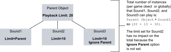 Also keep in mind that the limit applies only to sound objects that are within the selected object's hierarchy. If a child object has the Ignore Parent option enabled, it is no longer part of that limiter hierarchy and is not controlled by the parent's limit.