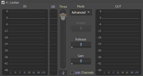 The advanced limiter is the most transparent of the three limiters while allowing more control over the output. This is because the signal does not exceed the threshold. It achieves this by introducing a small latency of 2.67 ms. This allows the limiter to automatically configure the attack and react to peaks smoothly, before the input reaches the threshold. The threshold, release stage, and an output gain can be configured in this mode.