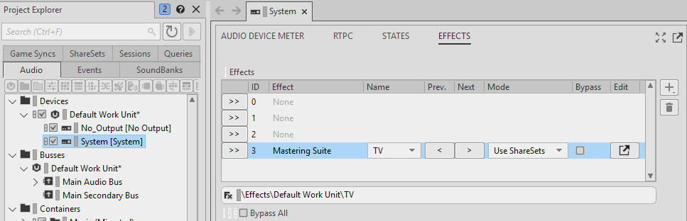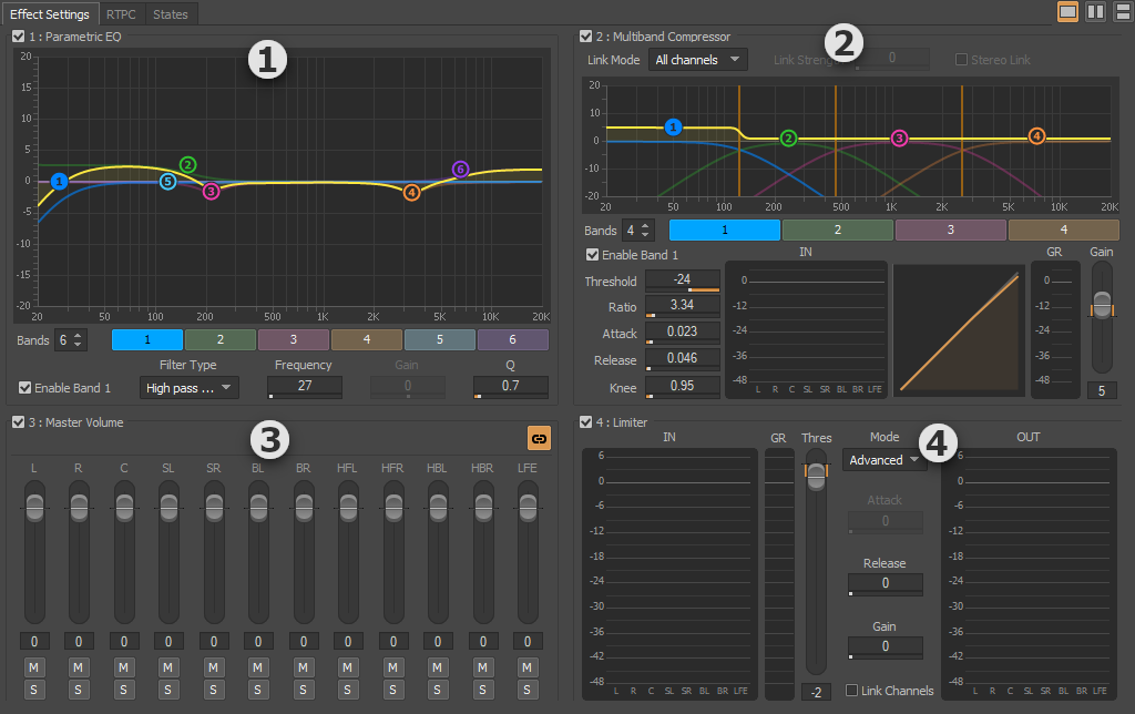 To use the Mastering Suite, the plug-in must be installed on Wwise. See Installing Premium and Partner Plug-ins. The plug-in requires a license to be activated and for SoundBanks to be generated successfully. You can acquire a free license from Audiokinetic at Plug-ins: Mastering Suite.