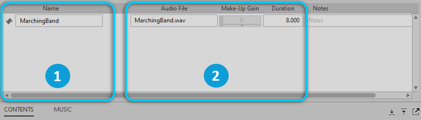 When you load a Music Track into the Property Editor, its source is displayed in the Contents Editor. Its properties are displayed, but only its notes can be edited here.
