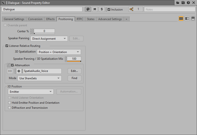- Positioning tab, enable Listener Relative Routing and select Position + Orientation for the 3D Spatialization. Add an Attenuation with a reasonable Max Distance.