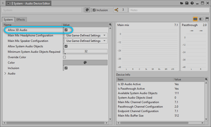 Selecting this option is not a guarantee that 3D audio will be activated; 3D audio is only activated if the platform supports it. Refer to Audio Device Editor: System for details on the other elements in this view. |