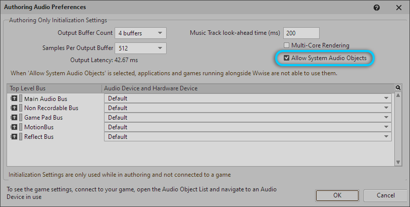 To profile Audio Objects played through Wwise Authoring, as opposed to from a game engine, System Audio Objects must be enabled for use by Wwise. |