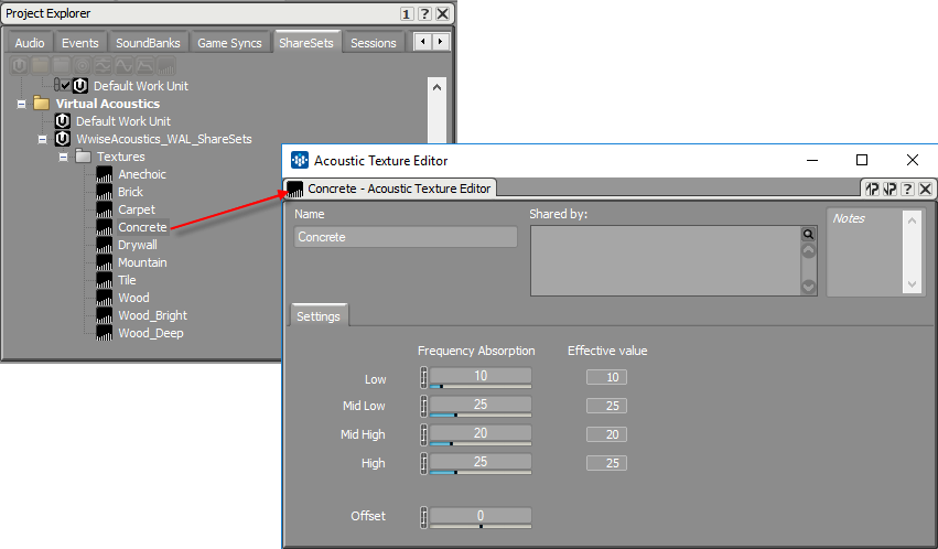 For each reflecting triangle, the game passes the ID of a material. These materials are edited in the Wwise Project in the form of Acoustic Textures, in the Virtual Acoustics ShareSets. This is where you may define the absorption characteristics of each material.