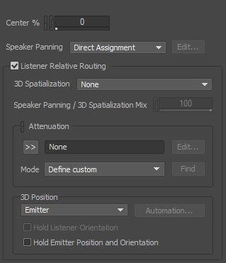 ![]() | Warning: Although the ER bus's Listener Relative Routing must be enabled in order to ensure that all its emitter-instances merge into the listener's busses, the 3D Spatialization mode must be set to None, to avoid "double 3D spatialization" by Wwise. Likewise, you should not use attenuation, unless you want additional attenuation to be applied on top of the image-source curves in Reflect. |
