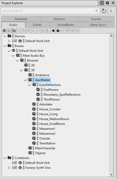 On the other hand, Reflect should run in parallel with the aux busses used for the late reverberation. The figure below shows a typical bus structure, where the three Auxiliary Busses under the EarlyReflections bus each contain a different ShareSet of Reflect. You will note that in this design, we only use a handful of ShareSets for generating early reflections. This is motivated by the fact that the "spatial aspect" of this Effect is driven by the game geometry at runtime. We only use different ShareSets here because we want different attenuation curves for sounds emitted by the player (listener) than those emitted by other objects. Using Reflect's simplified mode can also reduce the number of Reflect ShareSets needed. You can read more about it in the Intended Reflect Workflow.