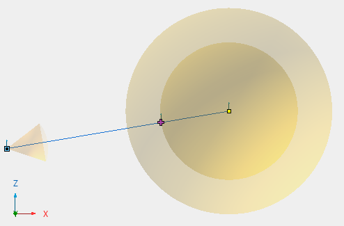 The inner radius is also used to calculate the distance between the listener and the radial emitter. The distance sent to the Attenuation of the sound is the distance between the listener's position and the closest point on the surface of the inner radius sphere. In the Game Object 3D Viewer, a plus sign icon indicates the virtual position of the radial emitter.