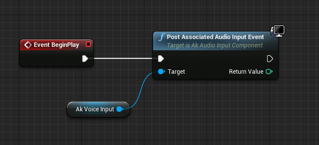 After you add the class to an Unreal project, you can create a custom Blueprint class that has an AkVoiceInputComponent, and can call the Post Associated Audio Input Event Blueprint function (from base class AkAudioInputComponent) to start sending microphone data to Wwise. The following image shows part of the Blueprint for a custom Blueprint class, based on Actor, that has an AkVoiceInputComponent called AkVoiceInput.