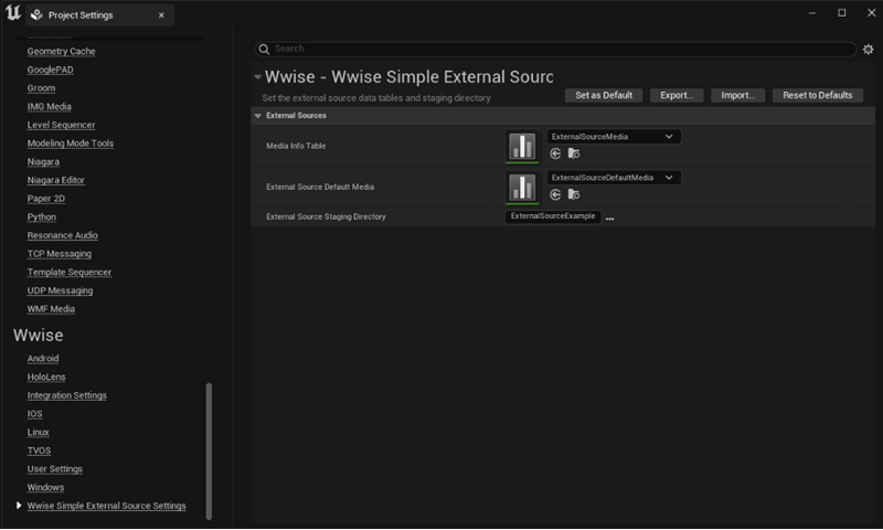 There are two Data Tables and a Directory to set in the Wwise Simple External Source Manager Settings: