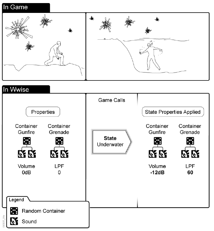The following illustration demonstrates how the properties for the volume and low pass filter for the gunfire and grenade sound objects are affected when the underwater State is called by the game.
