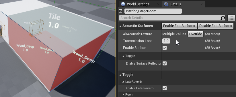 Acoustic surface properties on Spatial Audio Volumes are now easily identified in Unreal. This includes acoustic texture name, associated color, and the Transmission Loss value. Additionally, you can now use Brush Editing mode in the Unreal Editor to directly change the surface properties associated with one or more faces on a volume.
