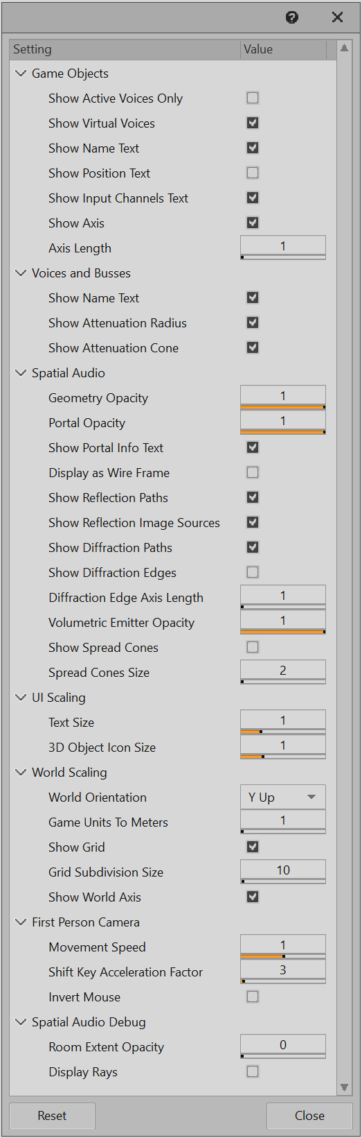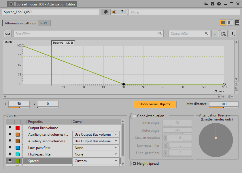 The ability to enable Height Spread has been added to the Attenuation Editor. Height Spread can be used in non-3D configurations (2.0 to 7.1) to add spread to compensate for the lack of speakers representing height. In a 7.1.4 configuration, where speakers representing height are present, height spread is applied below the listener, where there are no speakers to represent depth (i.e., negative height). This value is unused in Ambisonic configurations.