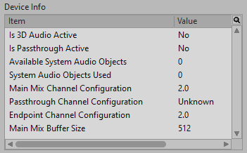 Information about the initialized Audio Device properties brings a greater understanding of the settings used to render audio by the endpoint. The Device Info panel shows the status and configuration of Audio Device properties, including: Is 3D Audio Active, Is Passthrough Active, Available System Audio Objects (if any), System Audio Objects Used (if any), Main Mix Channel Configuration, Passthrough Channel Configuration, Endpoint Channel Configuration, and Main Mix Buffer Size.