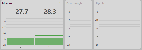 Meters have been added to the Audio Device Editor. These show the peak amplitude of the Main Mix, Passthrough Mix, and individual Audio Objects, depending on the output types enabled for the Audio Device.