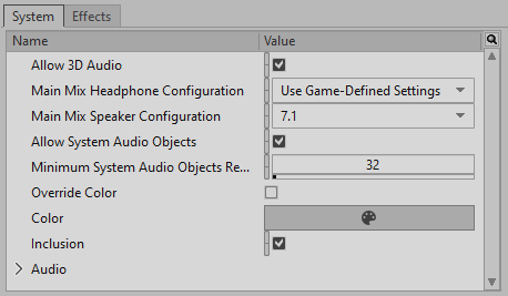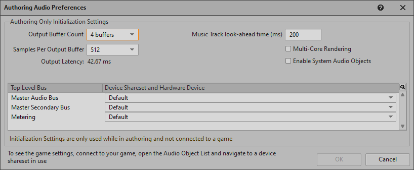 Initialization settings, used while auditioning through the Wwise authoring application, have been updated to include the ability to enable/disable System Audio Objects. When System Audio Objects are enabled for authoring, applications and games running alongside Wwise are not able to use them.