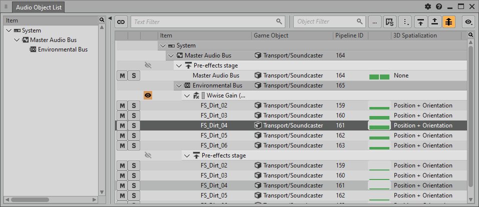 The Audio Object List is a new view that is comprised of a contextual Bus Filter and Audio Object List that leverage the recently introduced Filter Toolbar. This view helps to expose the state of Audio Objects as they pass through the audio pipeline, including any routing transformations that transpire due to processing. Audio Object visibility can be modified within the Audio Object List in order to view the Pre-Effects stage, Post-Effects stage, or all Effect stages, using the Effect stage buttons.