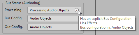 Busses in the Master-Mixer Hierarchy have been updated to present aspects of their Bus status to aid in the understanding of authored properties. Specifically, information about the Processing status, Bus Configuration, and Output Configuration is reflected in the Bus Status (Authoring) group in the General Settings Tab of the Property Editor. This information is updated while authoring, as well as when connected and profiling. It helps to expose the effect of a bus on the sounds routed through it.