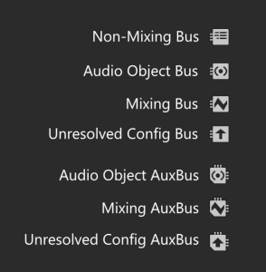 A suite of icons has been added to indicate the status of an Audio Bus or Auxiliary Bus at-a-glance. These icons are seen in the Project Explorer Master-Mixer Hierarchy and in some of the profiling views. The bus status icons represent the authored processing status of busses and provide a way to understand the mixing or Audio Object flow through to the Master Audio Bus.