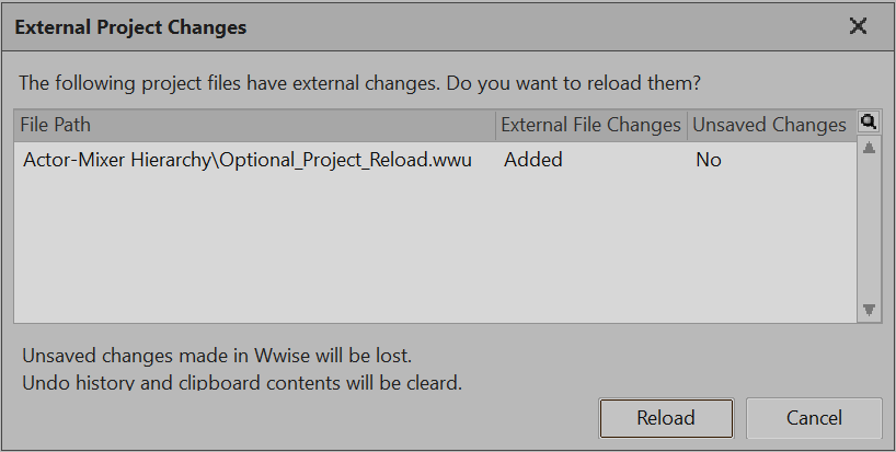 External project changes now allow for the ability to reload or cancel the reloading of a Wwise project due to external changes (i.e., adding, removing, or modifying files).